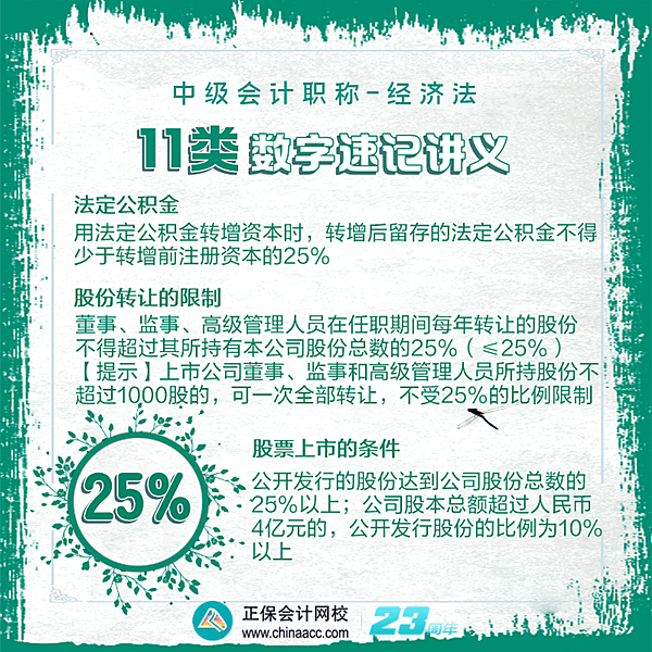 在中级会计职称《经济法》科目考点中,涉及到25%考点有:法定公积金、股份转让的限制、股票上市的条件。内容不多,考前快来每天读一读,希望对于大家冲刺有所帮助。