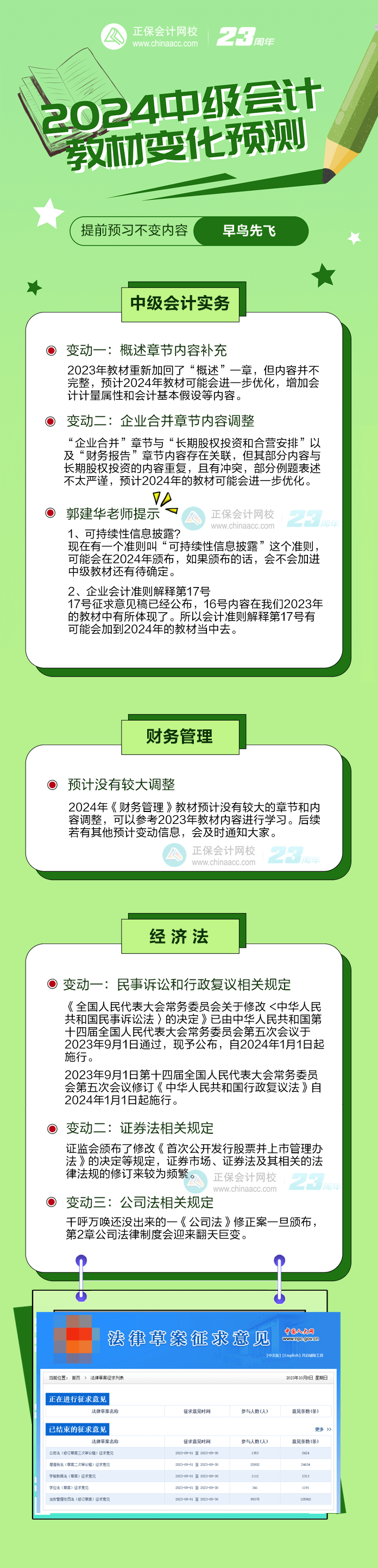 打算备考2024年中级会计职称,可以从现在开始预习,不需要每天听很多内容,坚持学习养成习惯,正式备考时才不会焦虑。预计2024年中级会计会有一定变化,各位考生可以先携 据23年教材结合本文教材变动预测提示进行预习。