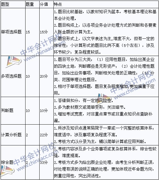 根据《关于2014年度全国会计专业技术资格考试题型等有关问题的通知 会考[2014]16号》获悉,2014年中级会计职称《中级会计实务》考试题型包括单项选择题、多项选择题、判断题、计算分析题和综合题五种,从近几年试题看,各题型之间的分值比例稳定,所占分值分别为15分、20分、10分、22分和33分。