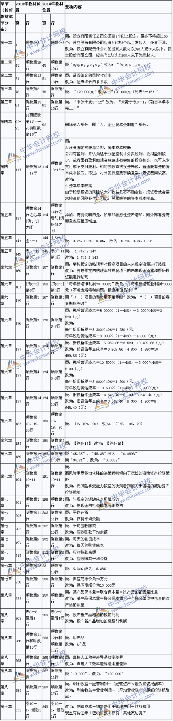 总体变化:整体来看,较2013年教材相比,变化不大。主要是第一章有限责任公司和股份公司设立时对股东人数的要求发生变化;第四章删除了企业资本金制度的知识点;第四章发行普通股股票的筹资特点发生变化;第八章剩余收益的计算公式进行了调整。其他基本上都是对2013年教材的不妥之处进行的修正。具体参见下表。