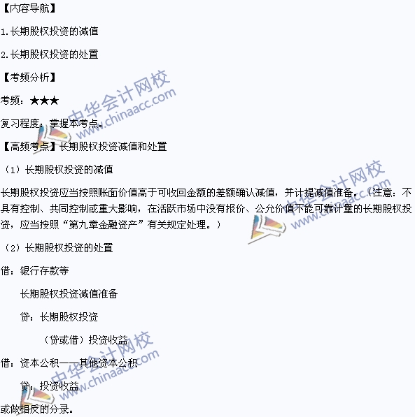 我们一起来学习2014年中级会计职称考试《中级会计实务》高频考点:长期股权投资减值和处置。本考点属于《中级会计实务》第五章长期股权投资第二节长期股权投资的后续计量的内容。