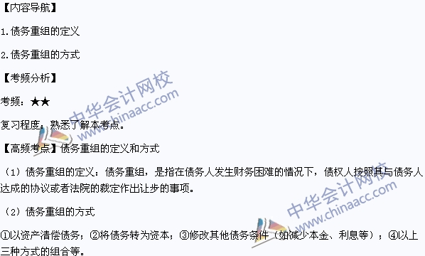 我们一起来学习2014年中级会计职称考试《中级会计实务》高频考点:债务重组的定义和方式。本考点属于《中级会计实务》第十二章债务重组第一节债务重组方式的内容。