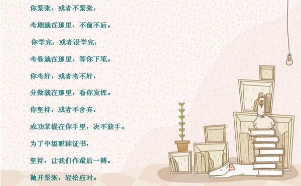 把考试想象成平时的模拟考试,只是把会做的做好,有难度的尽量解答。考试只是对于往日的努力的一次测试,我们不会因为考不好而失去什么,只会因为考的好而得到更多。
