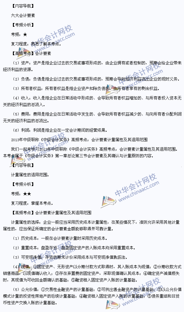 我们一起来学习2013年中级会计职称《中级会计实务》高频考点:会计要素。本考点属于《中级会计实务》第一章总论第三节会计要素及其确认与计量原则的内容。