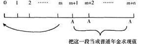 方法二:把递延期每期期末都当作有等额的收付,把递延期和以后各期看成是-个普通年金,计算这个普通年金的现值,再把递延期多算的年金现值减去即可。图示如下: