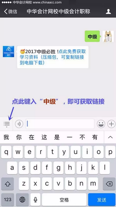 2、给“正保会计网校中级会计职称”公众号发送关键词“中级”,即可获取压缩包链接。