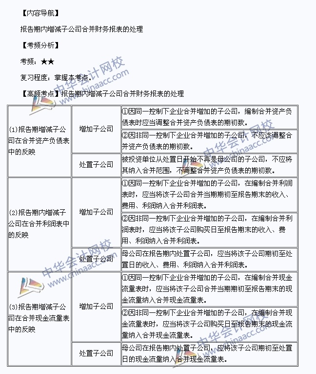 我们一起来学习2013年中级职称《中级会计实务》高频考点:报告期内增减子公司合并财务报表的处理。本考点属于《中级会计实务》第二十章财务报告的内容。