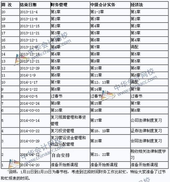 2、已报网校2014年中级会计职称辅导精品班、实验班的同学,将由班主任老师根据您的学习基础及学习时间制定更详尽的计划表,如与本表不一致,请以班主任老师制定的学习计划为准。