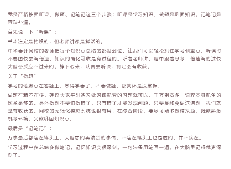 侯永斌老师的经济法延续了他初级授课的风格,讲课生动,举例形象,枯燥的知识都能讲出不一样的风景来,听完课后看教材上的那些字就活了,不再觉得怎么每个字都认识就是不知道说的是什么了。