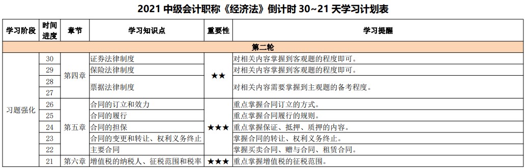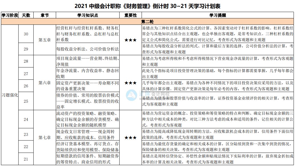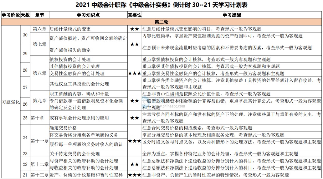 挺进30天!中级会计职称只有最后一个月了!正保会计网校例行为大家整理了2021中级会计考试倒计时30-21天计划表,最后一个月焦虑无措不知道学什么?照着计划做!