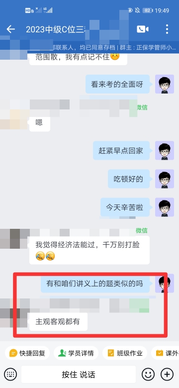 2023年中级经济法第二批次考试结束后,C位夺魁班学员在群里反馈考情,大家觉得这一批次的考试还挺友好的。同时也给还没考试的同学提了个醒:一定要去看看讲义和做过的题!