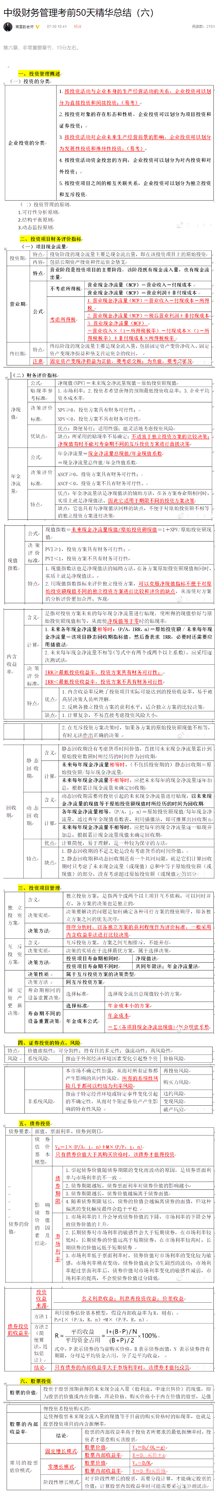 第六章投资管理为重点章,主要介绍项目投资和证券投资的有关知识。在考试中,考察题型很全面,并以主观题为主,而且每年都会单独或与其他章节合并考综合题。