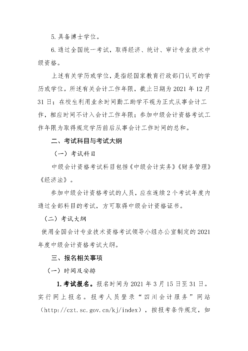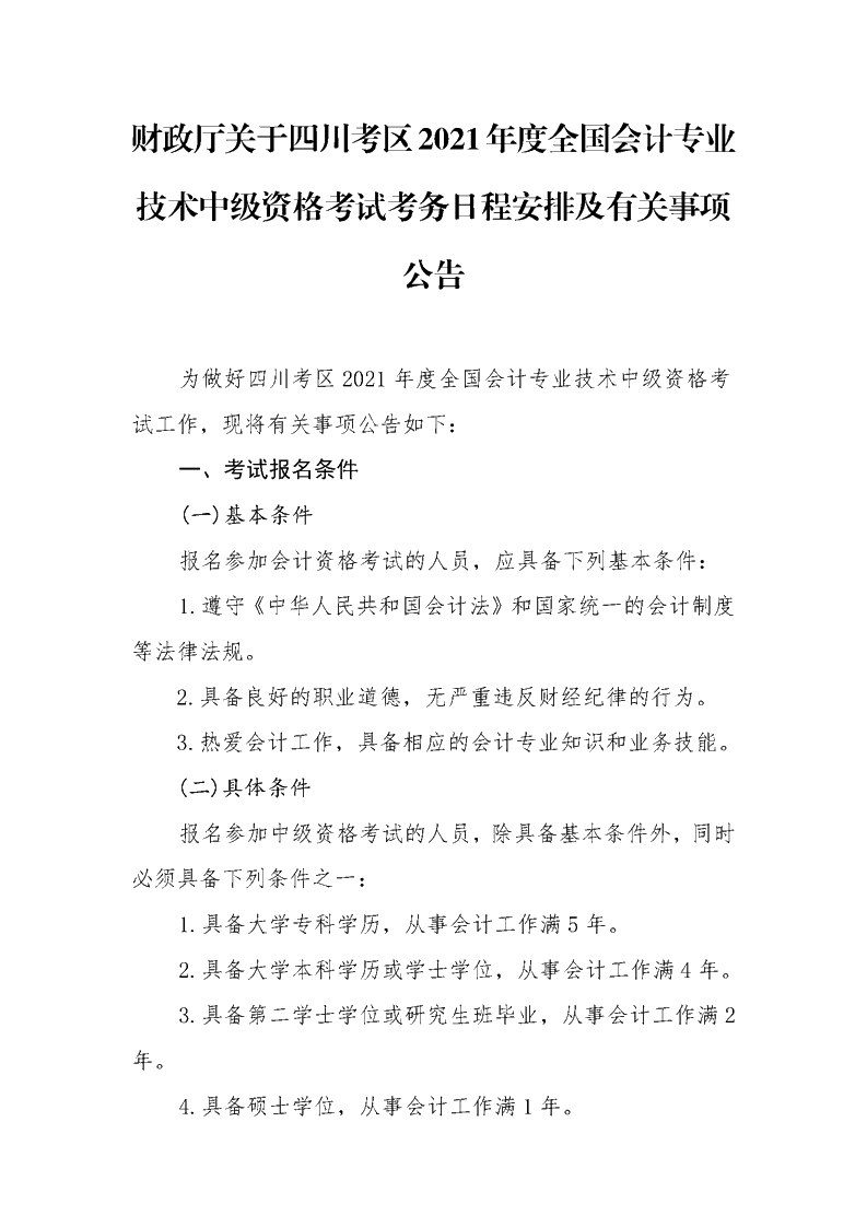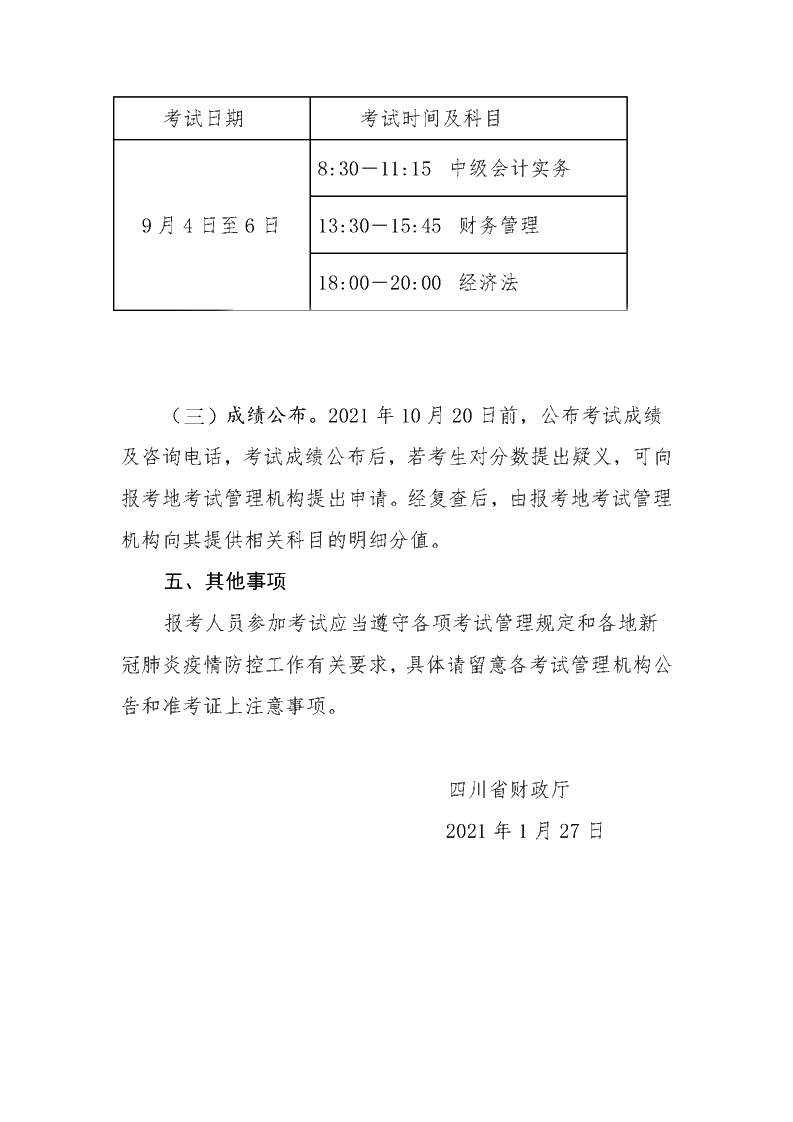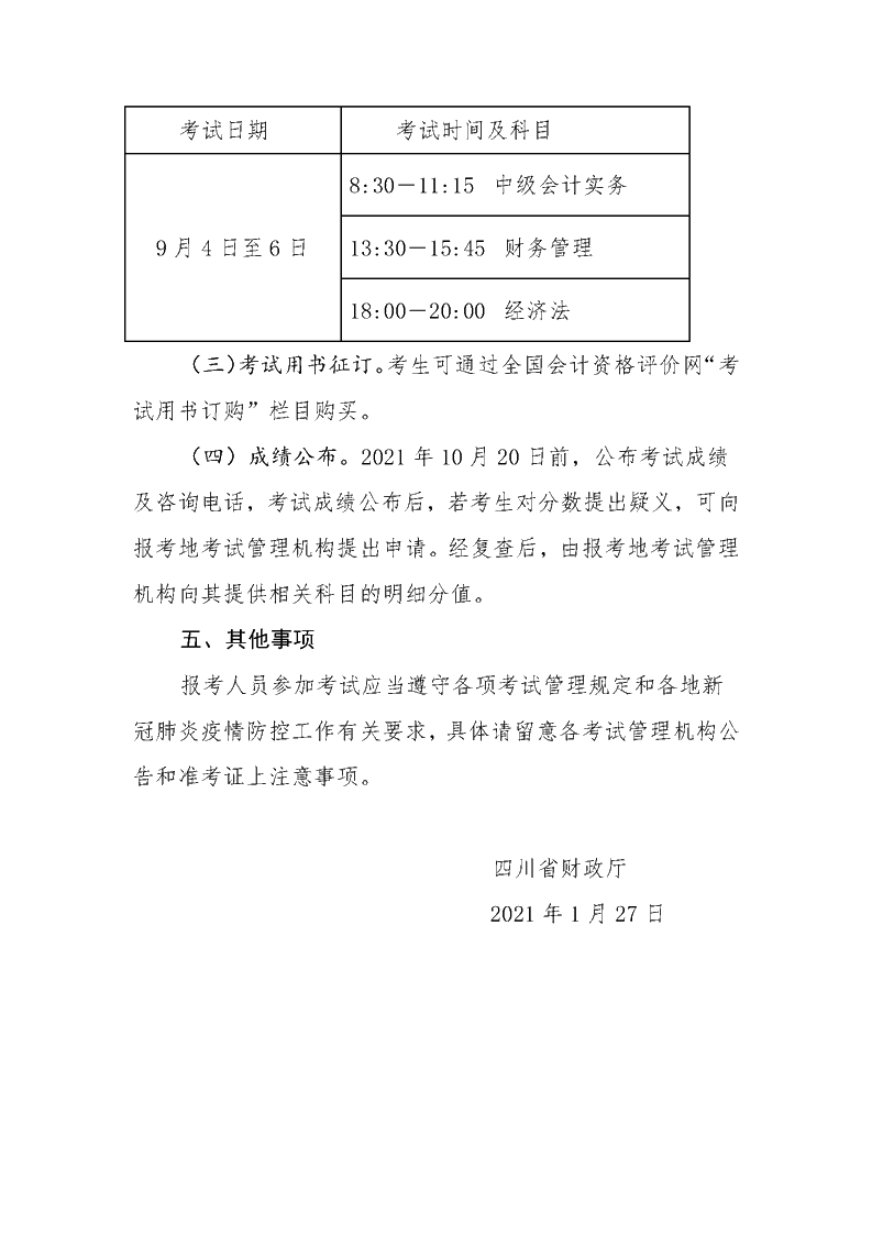 四川绵阳市财政局公布《财政厅关于四川考区2021年度全国会计专业技术中级资格考试考务日程安排及有关事项公告》,四川考生需在2021年3月15日至31日内报名,报名资格审核时间为3月16日至3月31日,时间截止到3月31日下午5点。考试时间为9月4日-6日。具体内容如下: