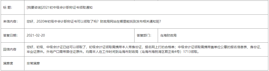 乌海财政局发布2020中级会计职称证书领取通知,经咨询目前可以领取中级会计职称证书,考生需前往乌海市财政局(乌海市海勃湾区君正街4号)1713领取,请查看以下详情: