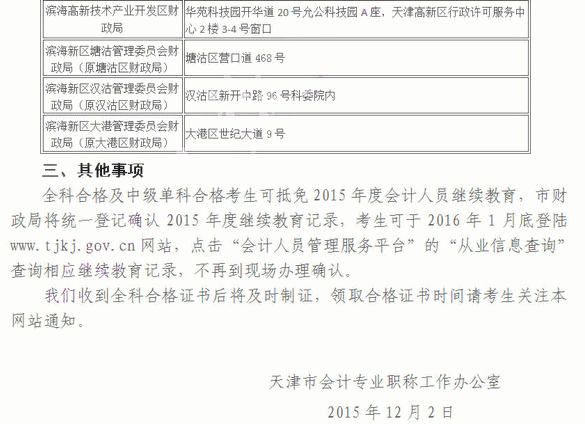 全科合格及初、中级单科合格考生可抵免2015年度会计人员继续教育,市财政局将统一登记确认2015年度继续教育记录,考生可于2016年1月底登录www.tjkj.gov.cn网站,点击“会计人员管理服务平台”的“从业信息查询”查询相应继续教育记录,不再需要到现场办理确认。