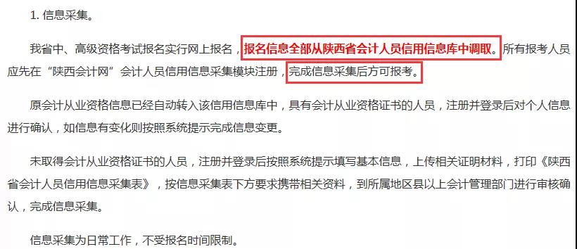 陕西省中、高级资格考试报名实行网上报名,报名信息全部从陕西省会计人员信用信息库中调取。所有报考人员应先在“陕西会计网”会计人员信用信息采集模块注册,完成信息采集后方可报考。(!!!)