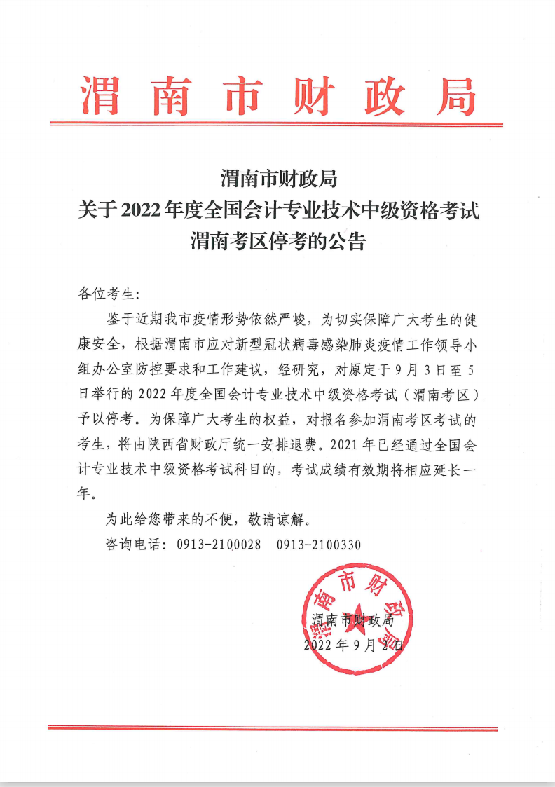 陕西渭南发布关于2022年中级会计考试渭南考区停考的公告,详情如下:
