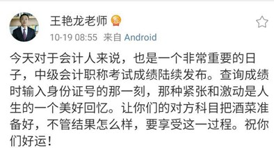 中级会计职称考试成绩查询之前,正保会计网校可爱的老师们就纷纷表示期待大家喜讯。
