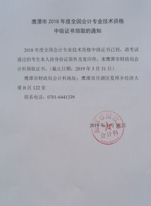 江西鹰潭市2018中级会计职称考试可以领取证书啦!鹰潭市2018年中级会计师考试合证书已到,证书领取2019年3月31日截止,成绩合格人员请携带考生本人身份证原件及复印件,到鹰潭市财政局领取证书。