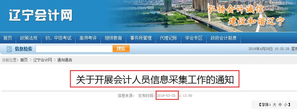 辽宁会计网于2019年3月底发布会计人员信息采集通知,表示当地信息采集自4月15日起,6月15日止。6月30日会将全部信息上报财政部。