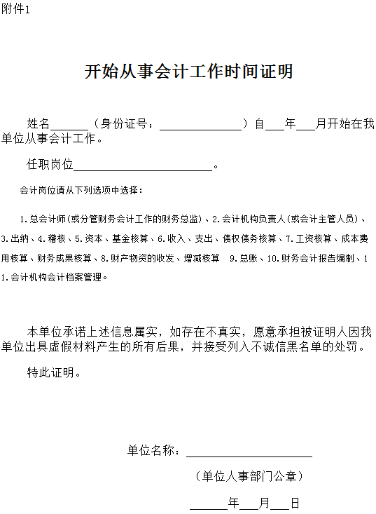 (4)会计从业资格证书,没有从业资格证书的考生需提供从事会计工作年限证明材料(模板见附件1,由报考人员单位提供并加盖所在单位人事部门公章);