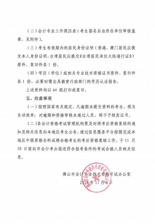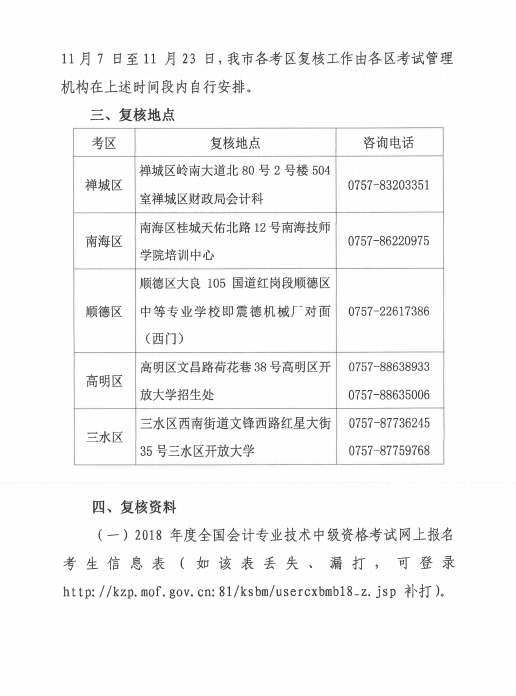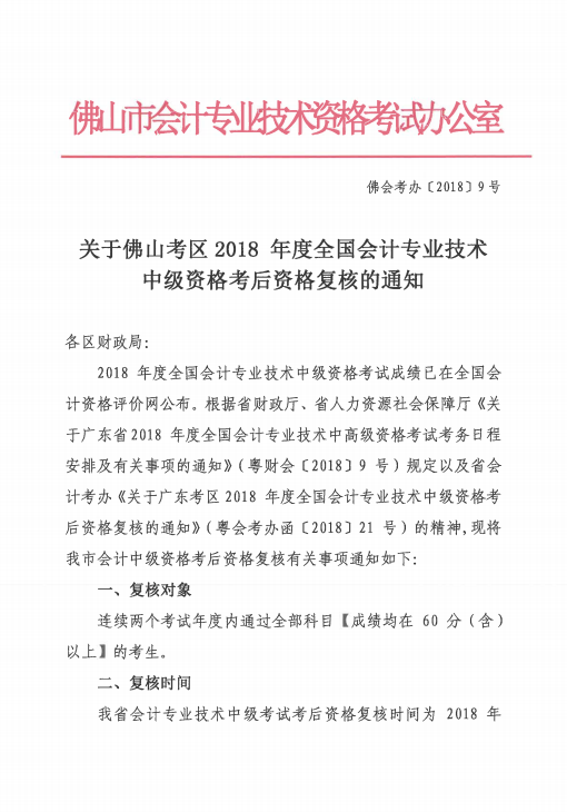 关于佛山考区2018年度全国会计专业技术中级资格考后资格复核的通知