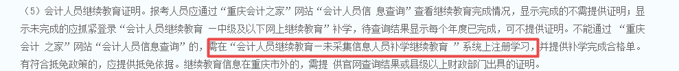 3、不能通过“重庆会计 之家”网站“会计人员信息查询”的,需在“会计人员继续教育—未采集信息人员补学继续教育 ”系统上注册学习,并提供补学完成合格单。有符合抵免政策的,应提供抵免依据。