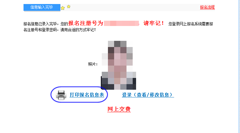 考生登录报名系统,信息输入完毕后,生成报名注册号页面,下方会提示考生打印报名信息表哦!