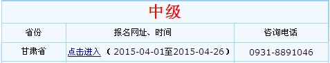 2015年中级会计职称考试报名工作于4月1日起在全国各地陆续展开,报名网站:“全国会计资格评价网”()、“会计行业管理网”(www.acc.gov.cn)。目前已开通了部分地区的中级会计职称报名入口,请广大考生在规定时间内完成中级会计师报名工作。点击下图进入甘肃报名入口>>