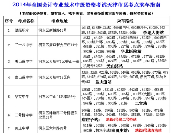 2014年全国中级会计专业技术资格考试天津市区考点乘车指南