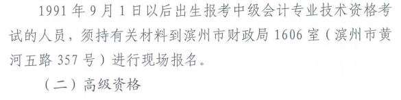 1991年9月1日以后出生报考中级会计专业技术资格考试的人员,须持有关材料到滨州市财政局1606室(滨州市黄河五路357号)进行现场报名。