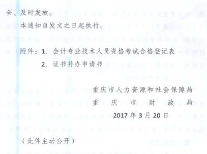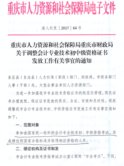 附件1:《重庆市财政局关于调整会计专业技术初中级资格证书发放工作有关事宜的通知》(渝人社发〔2017〕64号)