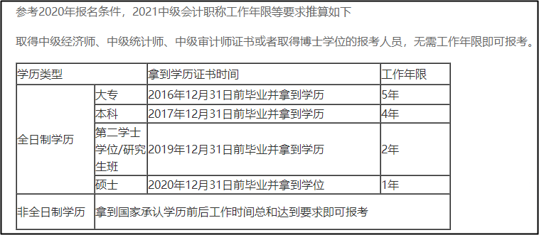 (四)上述从事会计工作年限,截止日期为2020年12月31日;在校生利用业余时间勤工助学不视为正式从事会计工作,相应时间不计入会计工作年限;参加中级资格考试工作年限为取得规定学历前后从事会计工作时间的总和。