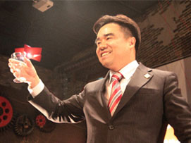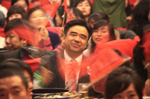 | 新春联谊会活动现场全景照 | 亲爱的朱总安坐于摇动的红旗中 | 碰杯! |