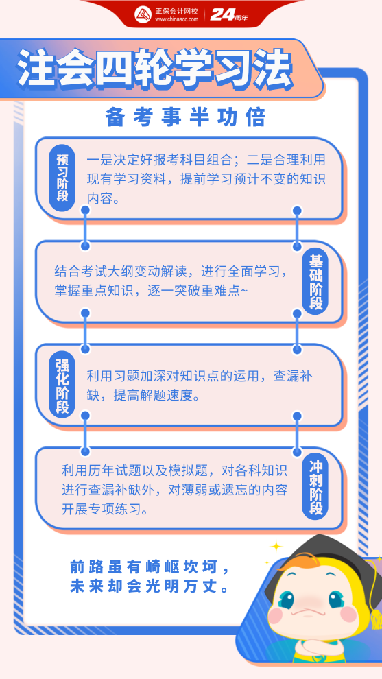 2024注会备考进行中,很多小伙伴来问网校老师备考的学习规划和时间安排,网校老师分析历年高分学员的经验,发现他们在备考注会时,通常会分四个阶段,所以大家可根据自身学习情况,确定出自己每个阶段复习的执行时间与目标。下面来看看注会高分大神们是怎么规划的吧~