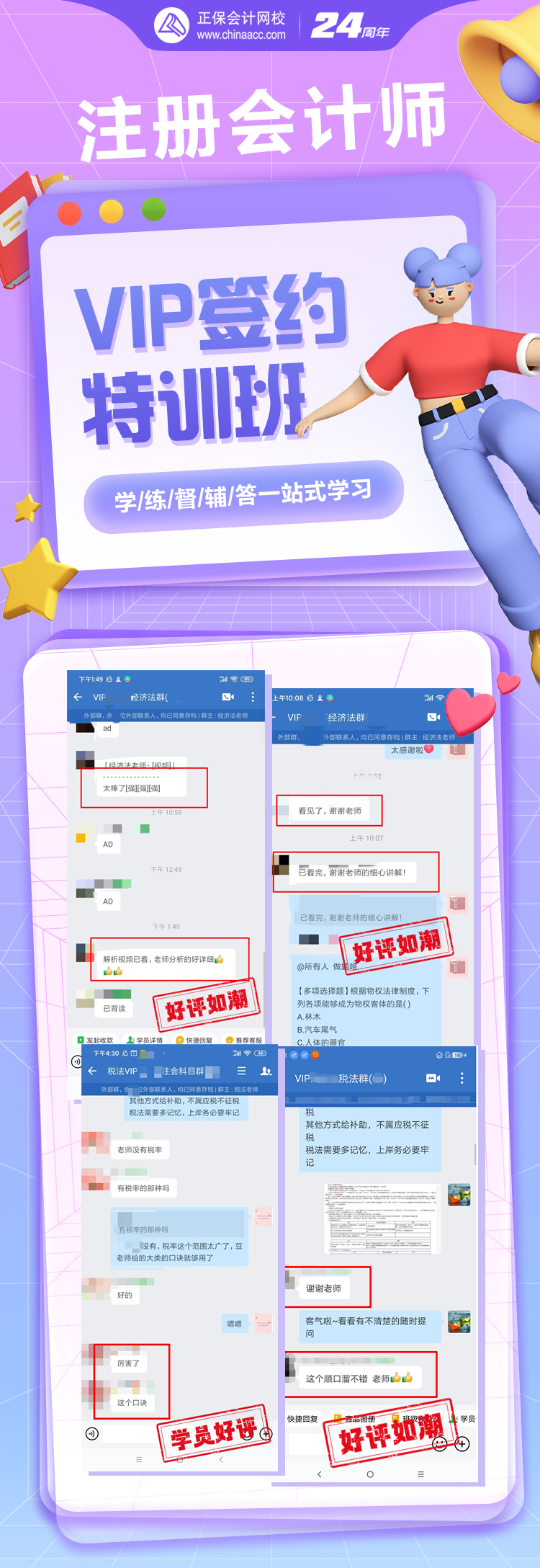 2024年注会考试时间已经确定,8月23日—25日举行专业阶段考试,8月24日举行综合阶段考试,8月31日—9月1日举行欧洲考区考试。2024注册会计师备考之路已开启!你的进度到哪里了?再不开始就晚啦!网校VIP签约特训班的学员们可是在埋头苦学呢,再不抓紧可就被远远的落下了!最近又收到了不少VIP班学员们的好评和感慨!下面跟着正小保一起来看看吧~