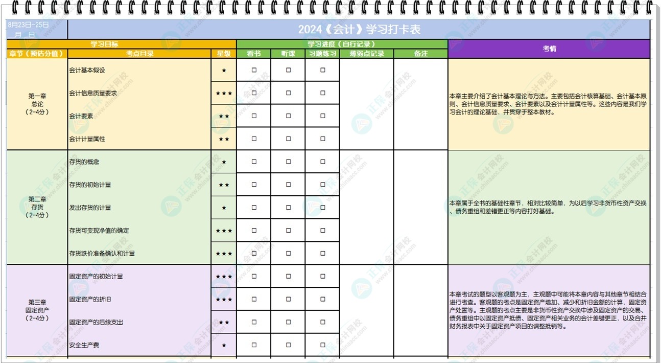 会计是很多同学都非常头疼的科目,因为涵盖内容比较广,所涉知识点比较多,也是注册会计师考试科目中难度比较大的考试科目,所以好多考生学习到一半就放弃了...总是三天打鱼两天晒网的同学注意啦!2024年注会保姆级学习打卡表来喽,懒人的自律救星,赶紧下载按计划打卡学习吧!