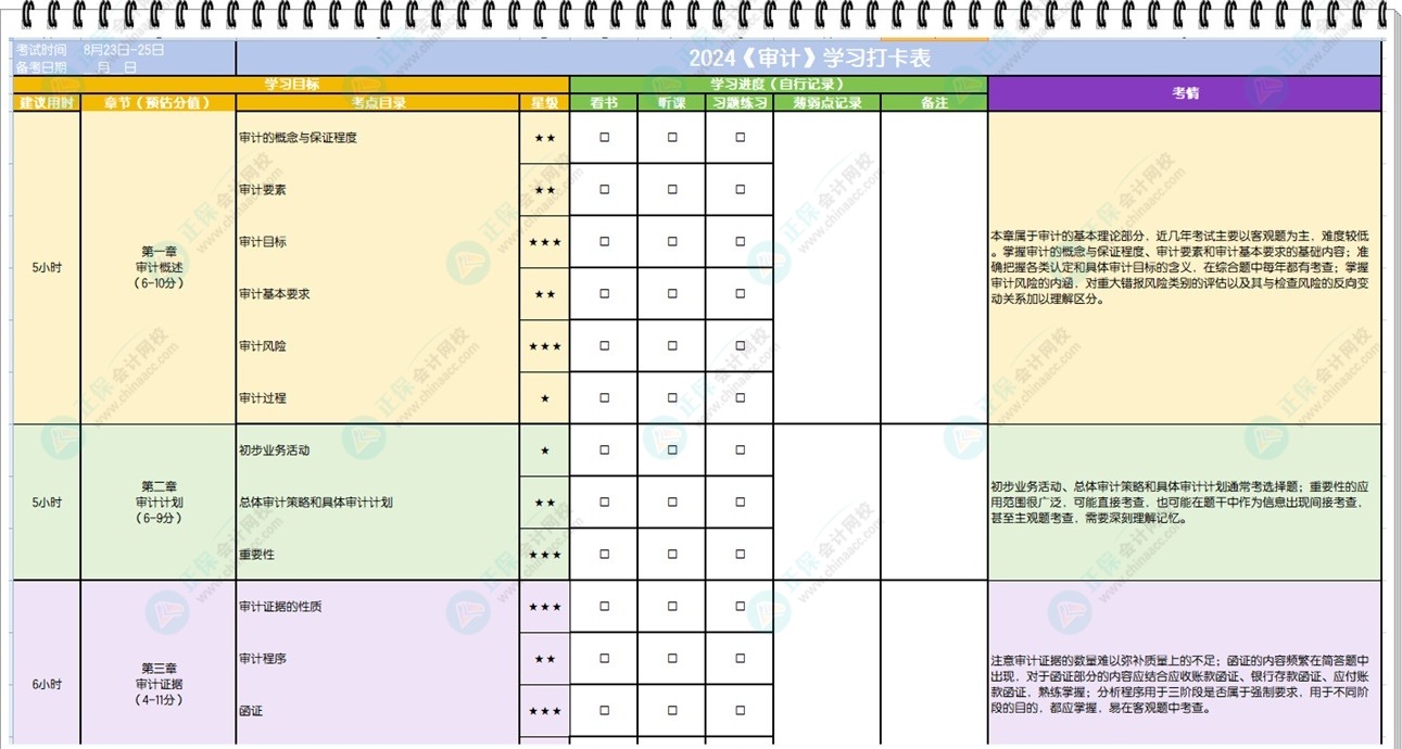 注会《审计》科目不仅仅是注会考试中难度数一数二的,知识点驳杂,术语理论晦涩难懂,做起题来摸不着头脑。很多考生学习到一半就放弃了...不要着急,正小保为大家准备了2024年注会保姆级学习打卡表,懒人的自律救星,赶紧下载按计划打卡学习吧!