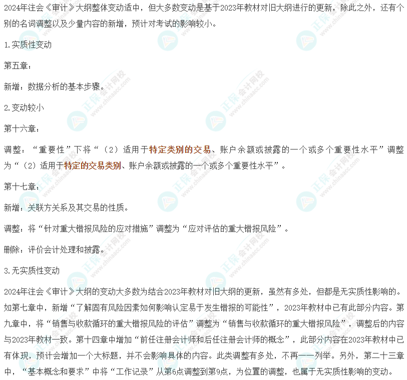 2024年注册会计师考试大纲已公布(点击查看大纲>)!2024年注会《审计》与2023年考试大纲变化大吗?别急!正保会计网校针对新旧注会考试大纲的变化进行了对比分析,让你轻松看懂变化!
