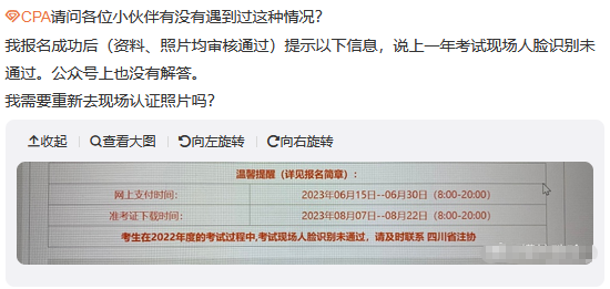 除此,注会报名期间,还经常有同学问:报名成功后(资料、照片均审核通过)提示上一年考试现场人脸识别未通过,需要重新去现场认证照片吗?