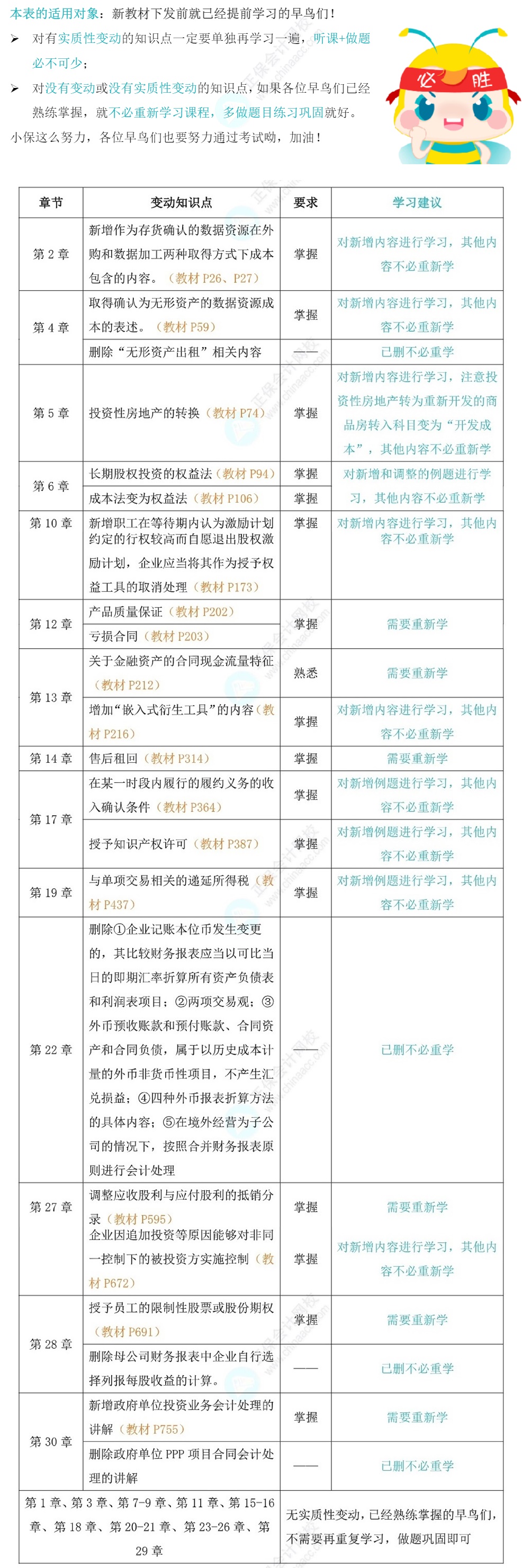 提前听课备考的早鸟们对于教材变动比较敏感,很多同学不知道自己要不要再学一遍?应该重点学习哪里?为此小保给各位“早鸟们”整理了2024年注会《会计》每章的变动知识点并配置了学习指导建议,一起看下吧!