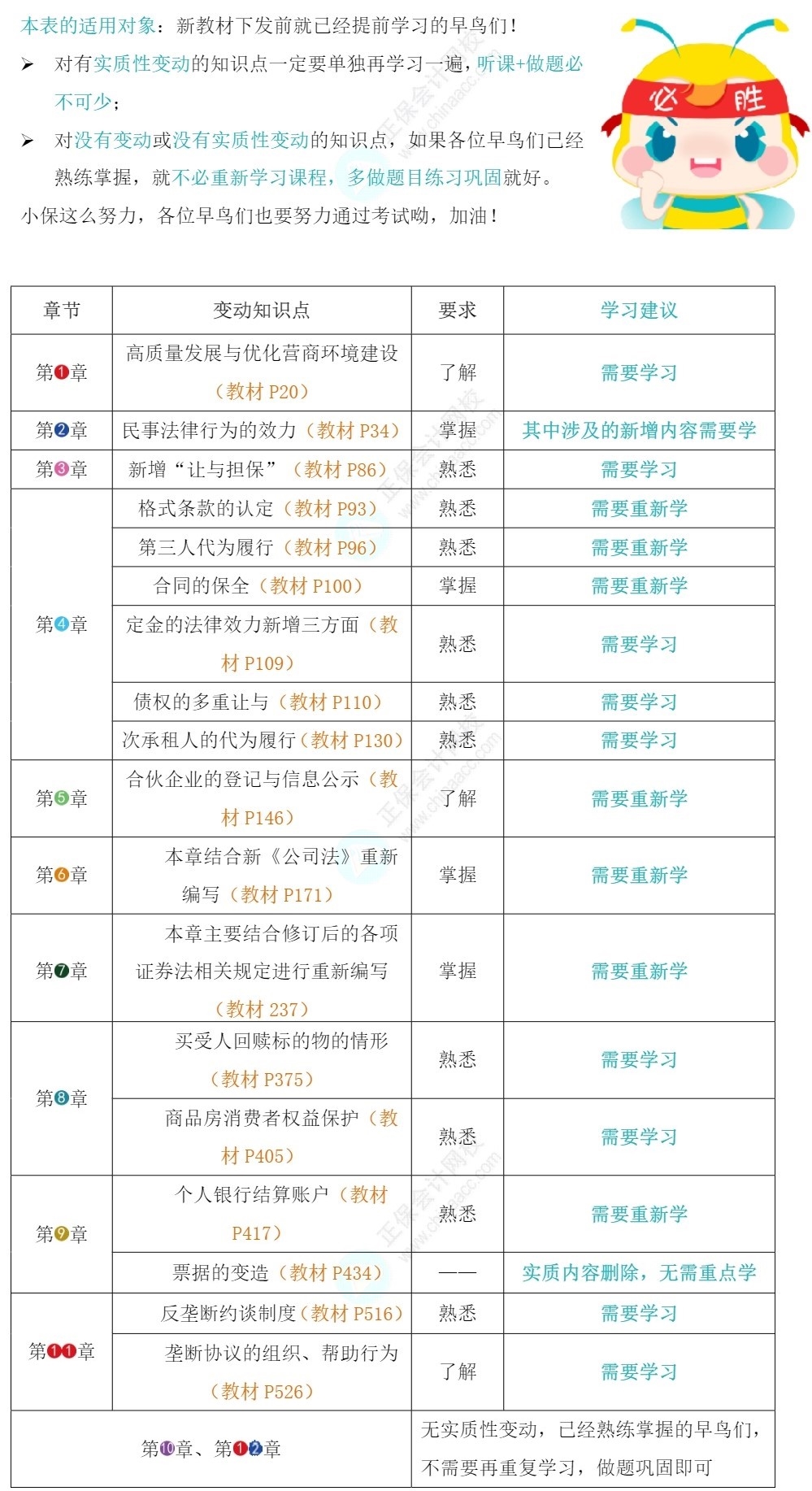 提前听课备考的早鸟们对于教材变动比较敏感,很多同学不知道自己要不要再学一遍?应该重点学习哪里?为此小保给各位“早鸟们”整理了每章的变动知识点并配置了学习指导建议。