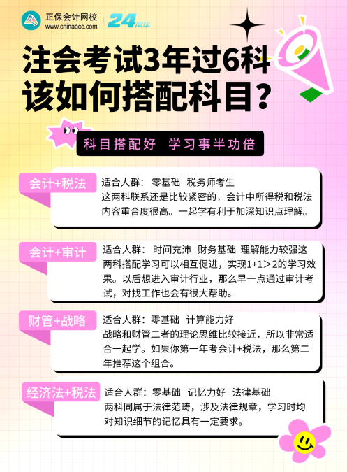 注册会计师考试科目数量比较多、考试难度比较大,对于期望在三年内完成六科考试的考生而言,合理搭配考试科目,科学规划复习进程至关重要。网校老师给大家列举一下3年过6科的科目搭配方案,希望能对大家的备考和科目选择有一些启发。
