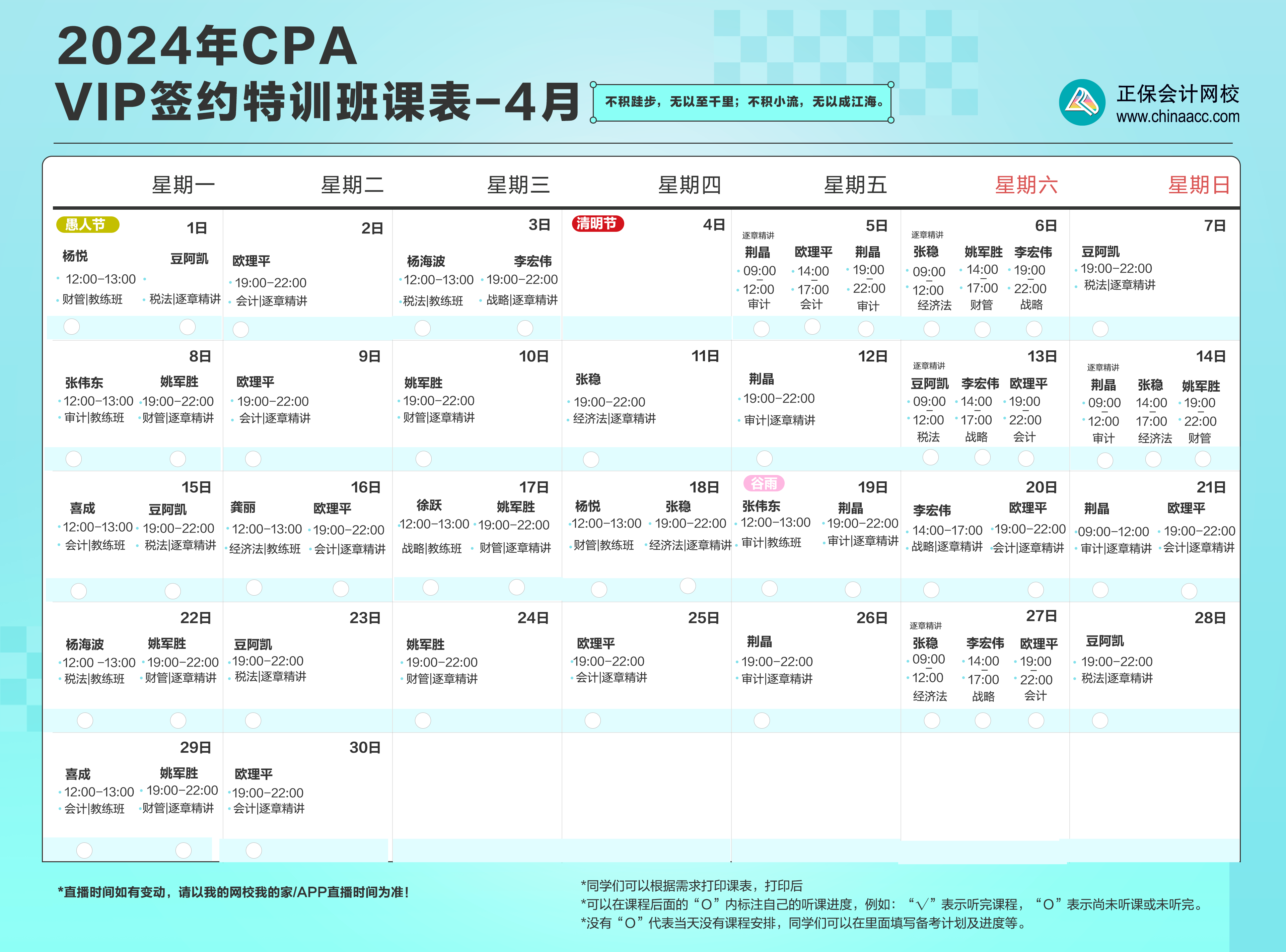 2024年注册会计师备考正当时,你学到哪里了?有没有跟着老师的课程进度走呢?为了方便大家提前安排自己的学习时间,2024年注册会计师vip签约特训班4月课表已备好!速来查收!