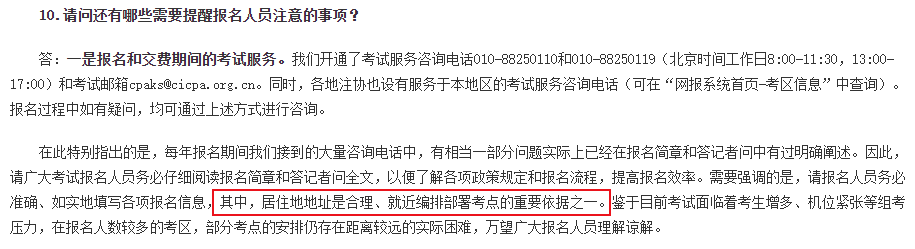 其实,中注协在早前就已经曝光了分配原则!我们可以从2024年的“中注协有关负责人就2024年注册会计师全国统一考试报名相关事项答记者问”中明确看出:居住地地址是合理、就近编排部署考点的重要依据之一。也就是说,在你报名时候所填写的居住地址,是中注协合理、就近编排部署考点的重要依据!