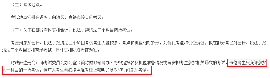 考虑到参加会计、税法、经济法三个科目考试考生人数较多,考点和机位相对紧张,为优化考点和机位资源,拟在部分考区对会计、税法、经济法三个科目安排两场考试。具体安排以准考证为准。
