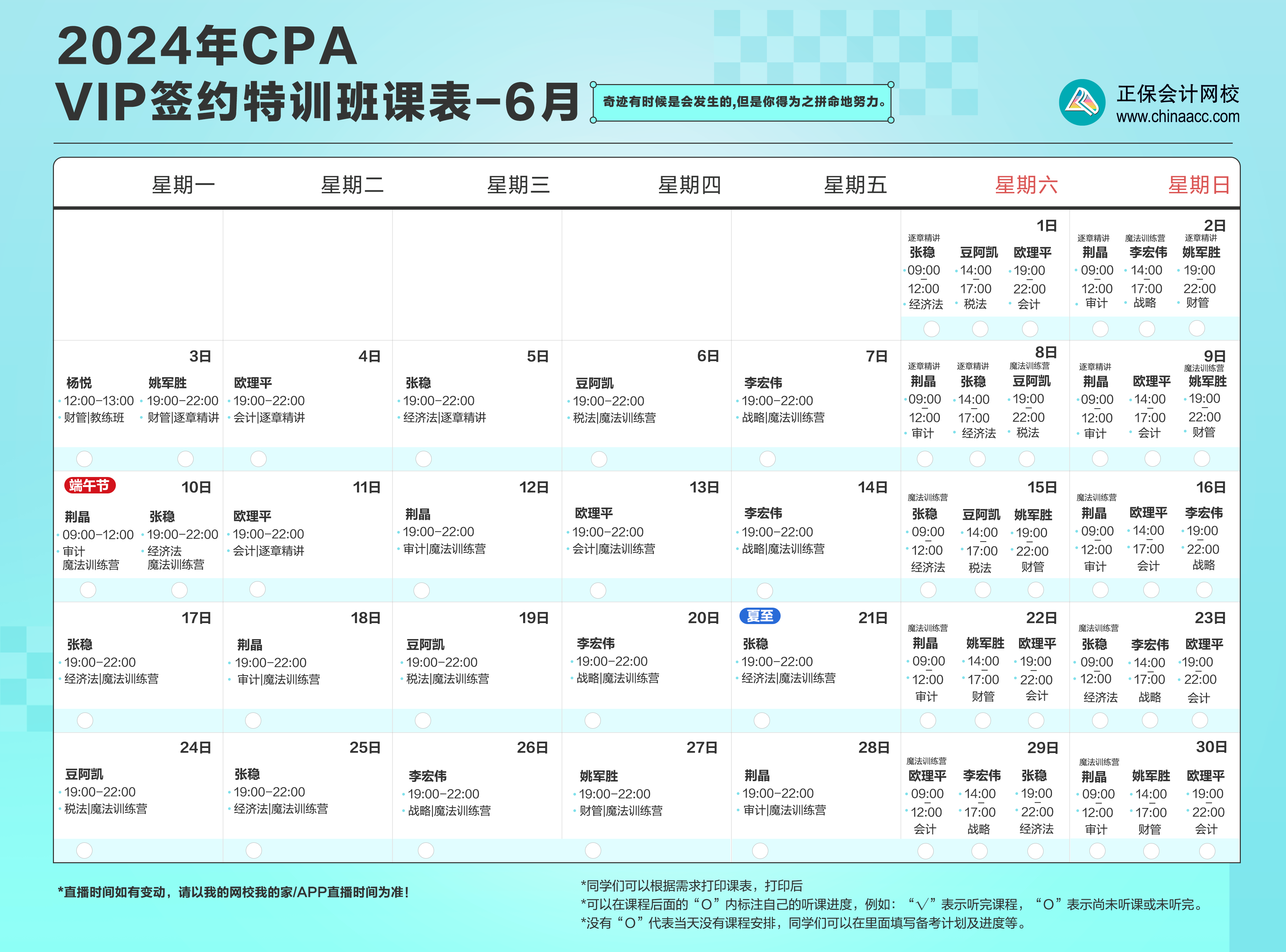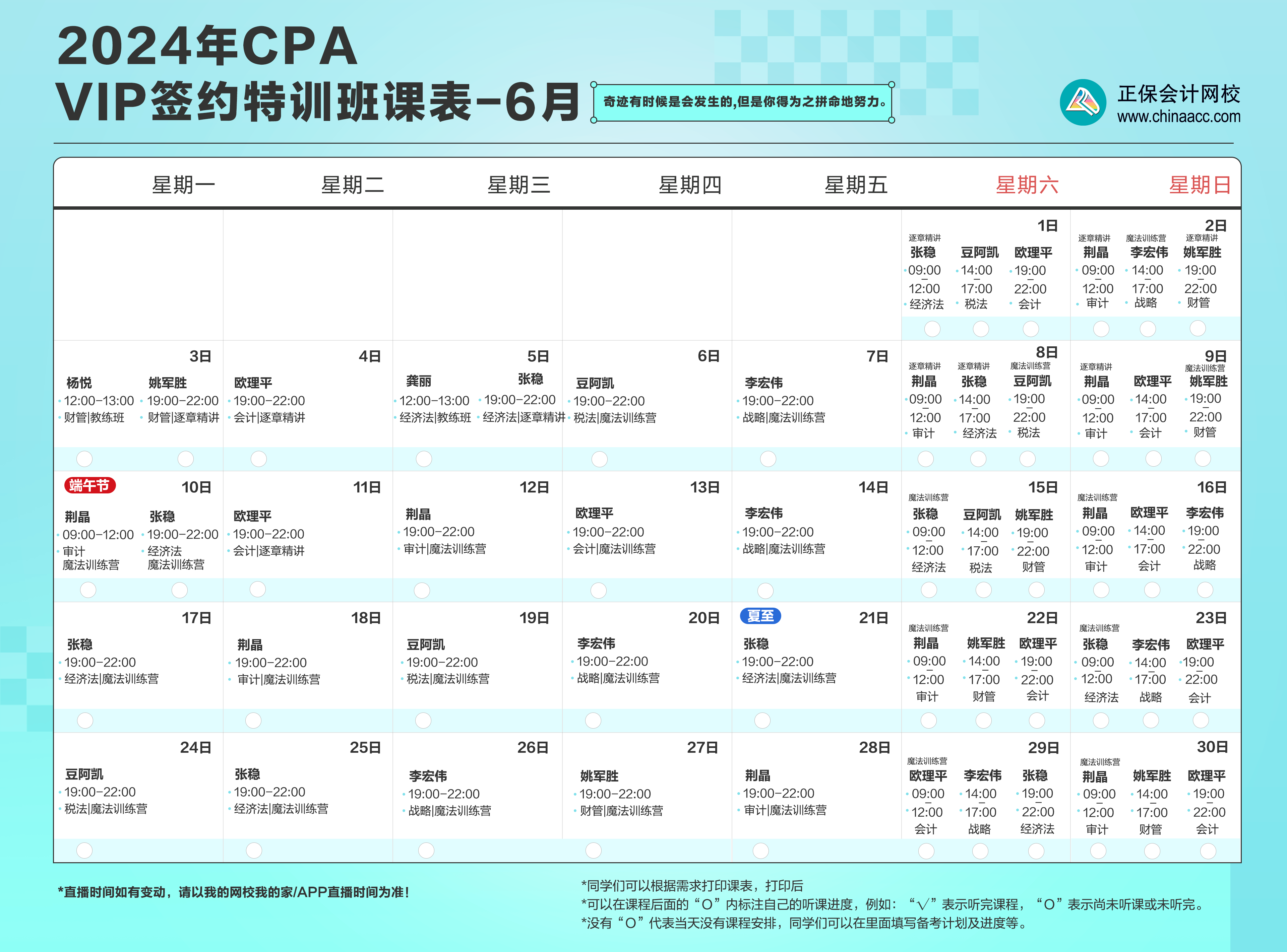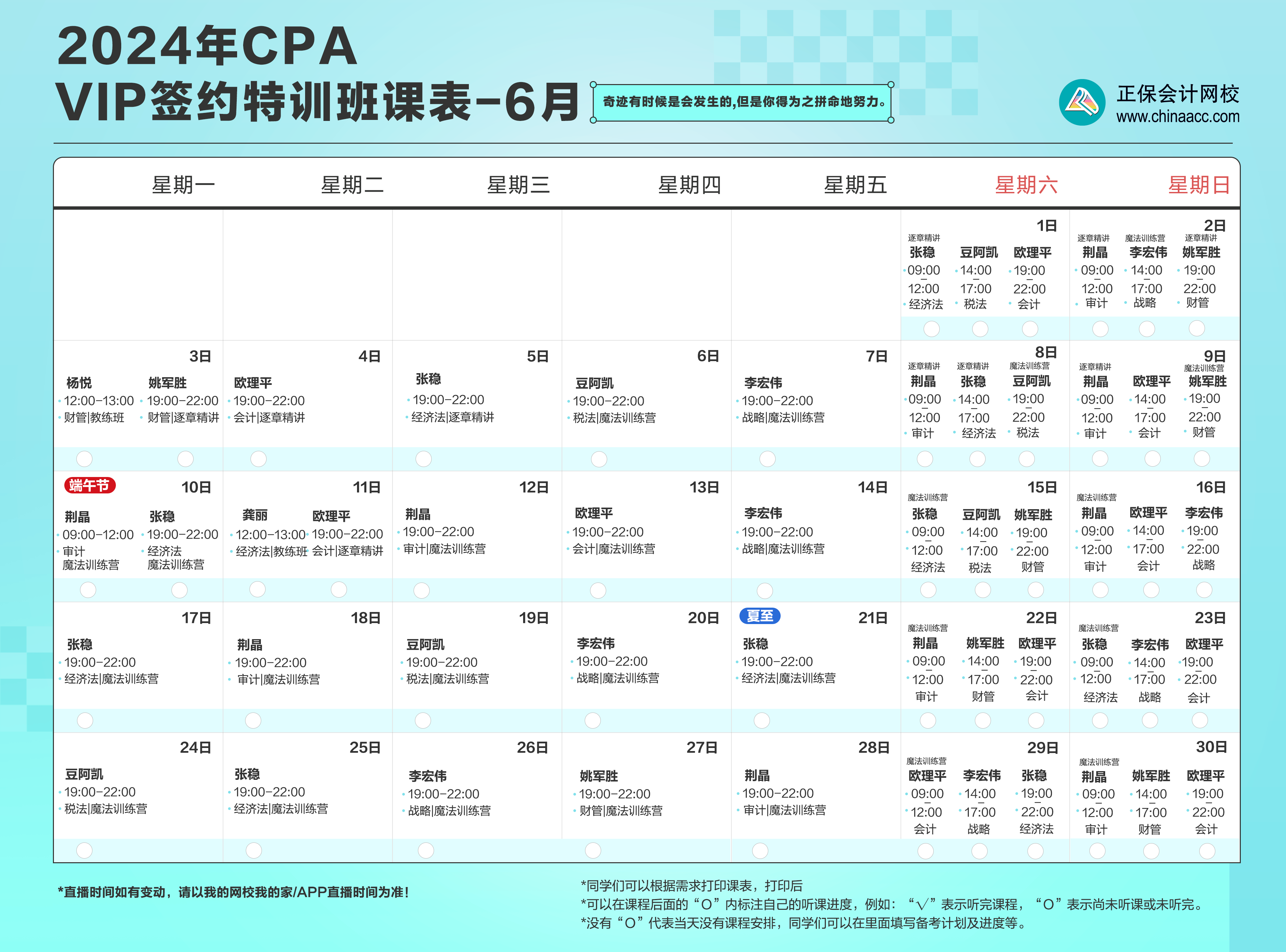 注会vip签约特训班的同学们注意啦!2024年注会vip签约特训班6月课表已出炉!请各位学员合理安排时间,不要耽误上课呦!