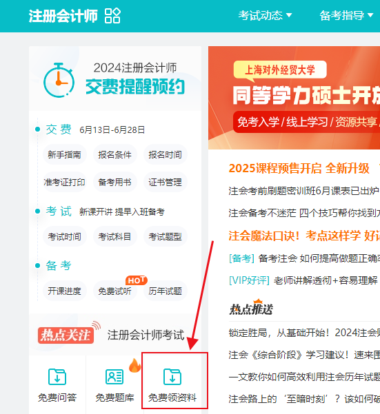 1、登录正保会计网校注册会计师栏目(戳这里进入>)——点击“免费领资料”即可进入领取注册会计师免费资料包。