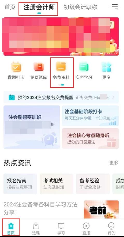 1、登录正保会计网校APP,选择注册会计师辅导——点击下方左侧”首页”——点击页面中间的“免费资料”即可领取注册会计师免费资料包。
