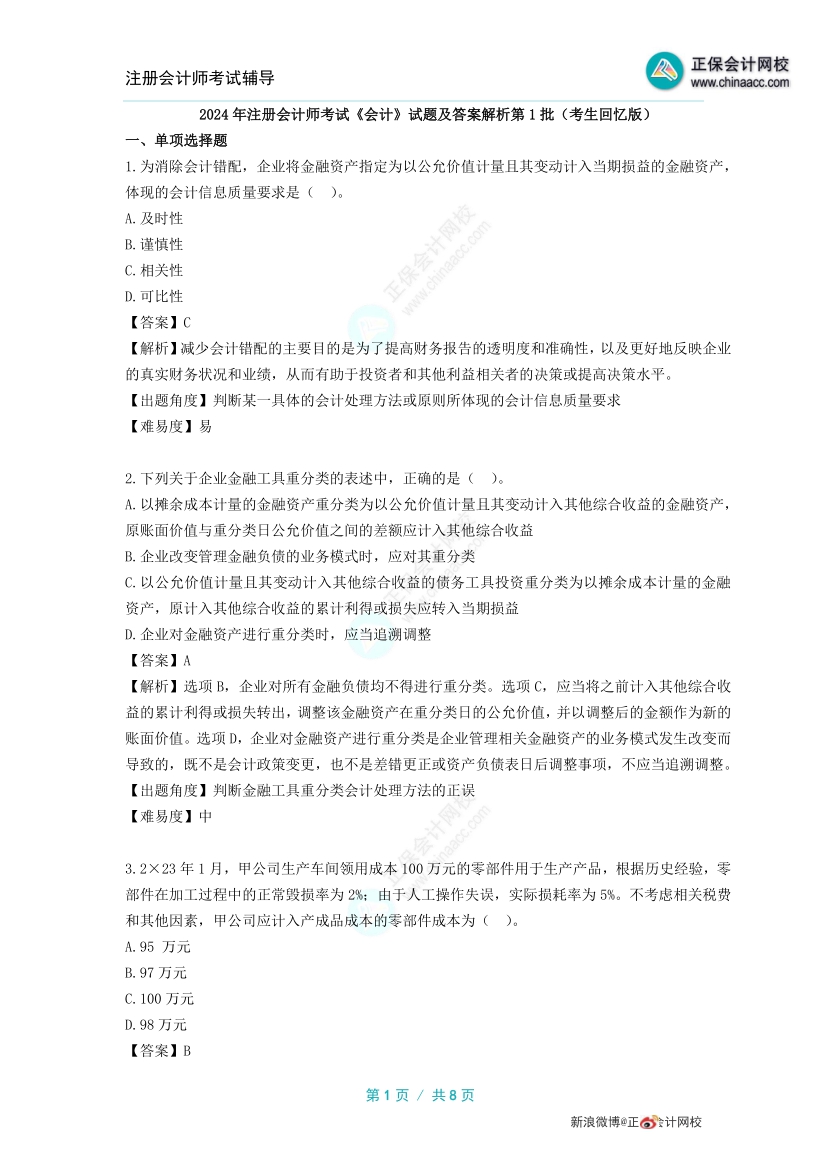 2024年注册会计师考试终于结束啦,同学们考的如何呢?正保会计网校特整理的2024年注会考试试题及参考答案,本文为注会《会计》第一场考试回忆版试卷,供大家参考,预估注册会计师考试成绩,一起来看看吧。